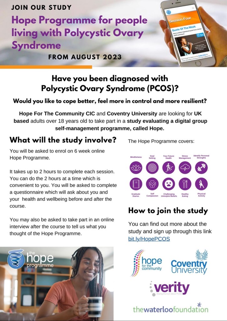 PCOS affects mental health, wellbeing and overall quality of life. Coventry University have worked with PCOS patients, Verity and healthcare professionals to create an online course to help. Those joining the Hope PCOS course are invited into an online group run by peers who have PCOS themselves and are trained to support and coach others.