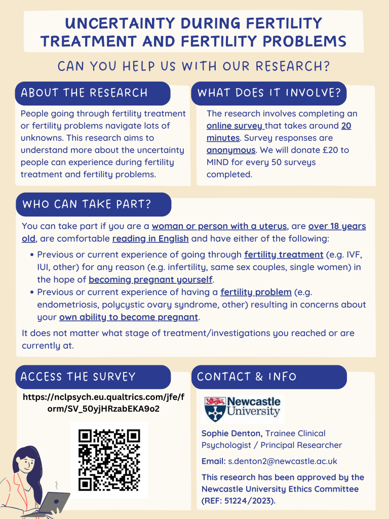 Can you help us with our research about the uncertainty that people can experience during fertility treatment and fertility problems? People going through fertility treatment (e.g. IVF, IUI) or fertility problems (e.g. PCOS, Endometriosis) navigate lots of unknowns throughout their fertility journeys, but little is known about their experiences of uncertainty. This research aims to improve our understanding of the uncertainty people can experience during fertility issues. We hope that this research will help us to understand more about how people can be better supported to manage the uncertainty that can come with these issues (for example, how psychological support could be improved for those going through fertility issues to reduce the distress that this uncertainty can cause).
