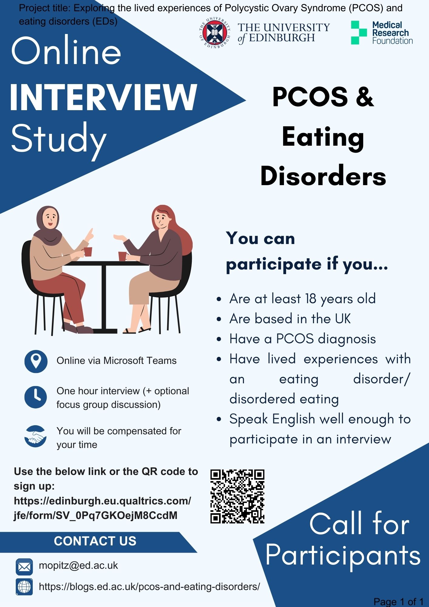 By sharing your experiences with us, you will be contributing to a better understanding of the challenges around living with PCOS, including how PCOS might be linked to eating disorder symptoms. You will be paid £25 (in the form of a voucher) for participating in an interview and an additional £25 voucher if you decide to participate in a follow-up group discussion.